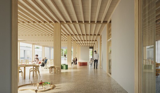 Die Konstruktion ist als tragende Holzkonstruktion geplant, basierend auf einem modularen Raster. Diese Konstruktion ermöglicht eine rationelle Vorfertigung und eine kurze Bauphase. Die konstruktive Struktur, die Schalldämmung und Beleuchtung ergeben zusammen eine warme und ruhige Atmosphäre, die sich perfekt für den Schulalltag eignet.