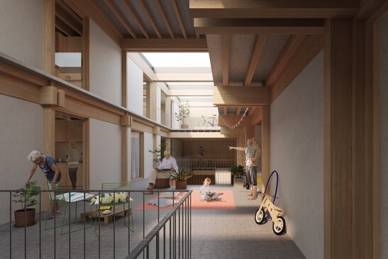 Erschliessungs- und Begegnungszone. Die Laubengänge dienen im Brandfall als