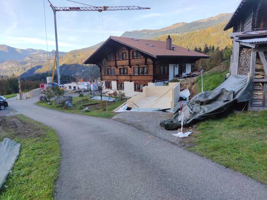 Im Geissholzli im malerischen Berner Oberland treffen die verschiedenen Epochen des Holzbaus aufeinander. Das Wohnhaus der Familie Maurer aus dem Jahr 1997 wurde in Blockbauweise (Fleckenbau) errichtet und zeigt die bewährte Zimmermannskunst. Dazu gehört ein guter konstruktiver Holzschutz mit dem grossen Vordach. Das Holz an der Fassade altert gleichmässig und hat eine schöne Patina. Die Konstruktionen der Wände und Decken sind vor Feuchte geschützt und sind für die Ewigkeit gebaut.
