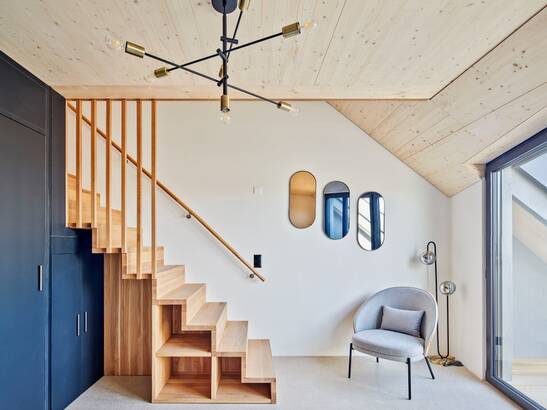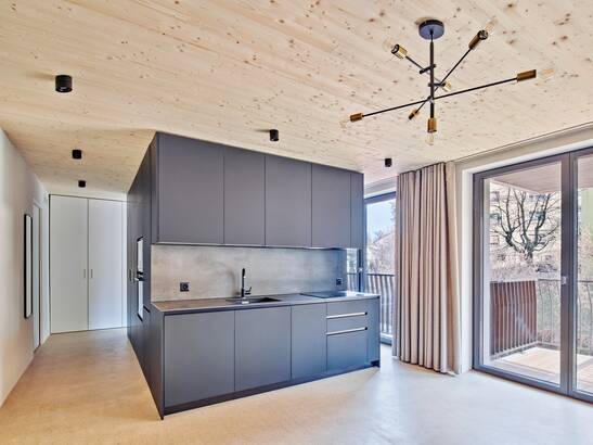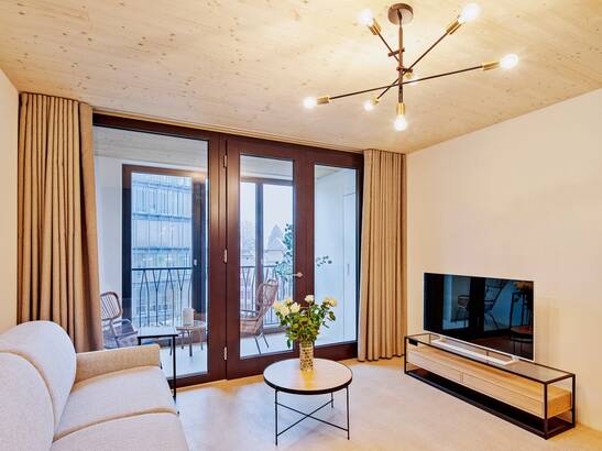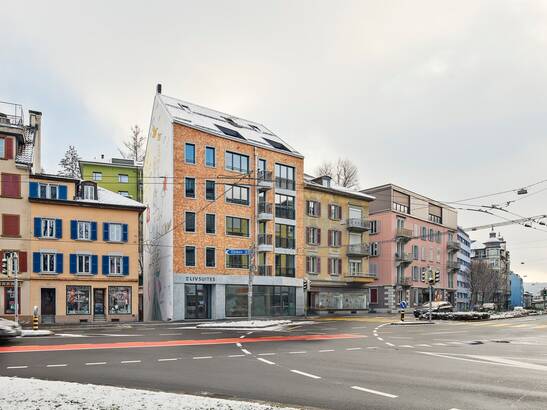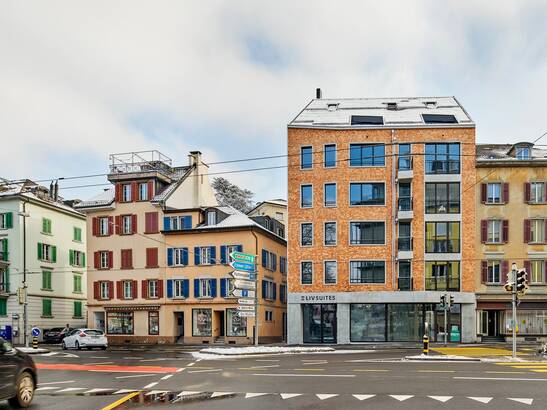 Die Liv Suites im siebengeschossigen Holzhaus im Herzen der Stadt Luzern bieten ein modernes Wohnerlebnis. Die Schindelfassade ist ein Hingucker. Brandversuche ermöglichen das durchlaufende Lärchenkleid ohne störende Schürzen oder Brandriegel.