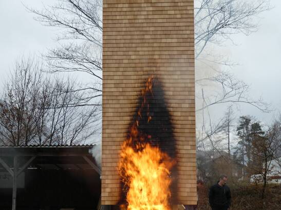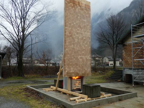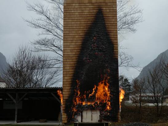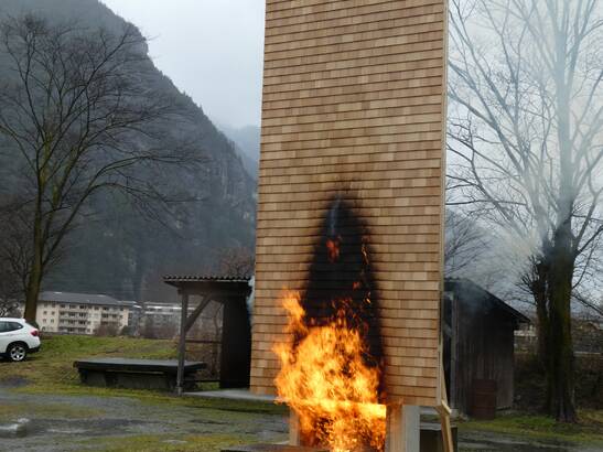 Bei den Versuchen in Andermatt diente ein erster Kleinbrandversuch an einem Muster die grobe Beurteilung des Brandverhaltens. In einem zweiten Schritt folgte in Absprache mit den Behörden ein Realbrandversuch an einem Fassadenstück.