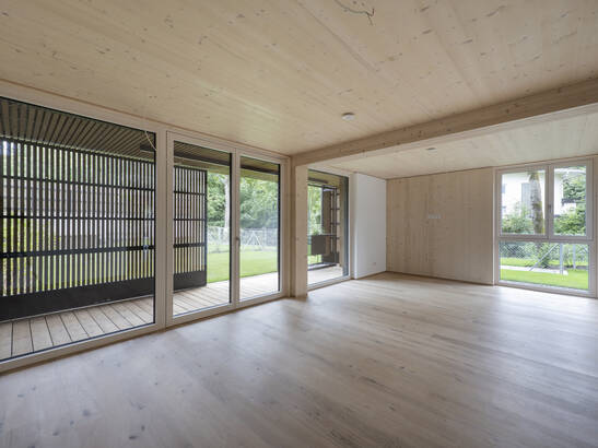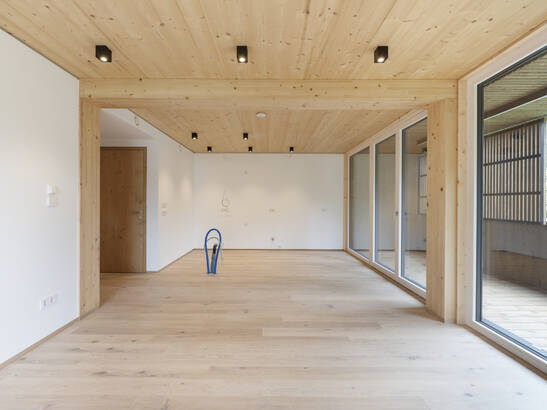 Einen weiteren Vorteil sieht Projektleiter Florian Huber in der kürzeren Errichtungszeit: «Wir konnten den Holzrohbau samt Fenstern, Balkonen und Fassade in nur zehn Wochen um- setzen. Dank vorgefertigter Holzelemente verkürzte sich die Bauphase im Vergleich zu herkömmlichen Bauweisen um sechs bis sieben Monate.» Bei diesem Vorzeigeprojekt wird der Baustoff Holz nicht nur zur Konstruktion des Gebäudes und für die Fassade verwendet, sondern auch im Innenbereich zum Teil sichtbar im Decken- und Wandbereich verbaut. Umweltschonende Materialien und nachhaltige Konstruktionslösungen bringen den insgesamt 34 Eigentumswohnungen den höchsten Qualitätsstandard «klimaaktiv Gold».