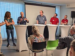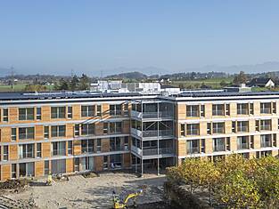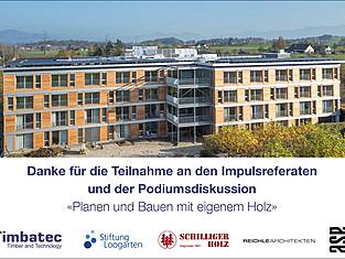 «Wer mit eigenem Holz baut, erhält ein Gebäude mit Mehrwert und schafft sich gleichzeitig den emotionalen Bezug zum eigenen Rohstoff». Zum Fokusthema «Planen und Bauen mit eigenem Holz» fanden im 2-geschossig neu aufgestockten «Esslinger Loogarten» Impulsreferate sowie eine Podiumsdiskussion statt.