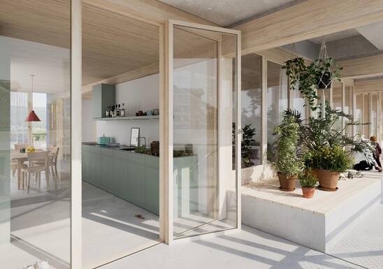 Den Grossteil der Nutzung (ca. 80 Prozent) sollen im Neubau allerdings Mietwohnungen ausmachen. Holz wird, wie bei der Fassade mit den Laubengängen resp. Balkonen, auch im Inneren das dominierende Material sein. Die qualitätsvollen, kompakten Wohnungen mit flexibler Grundrisskonfiguration heben sich von «herkömmlichen» Wohnangeboten ab und sollen eine urbane Bewohnerschaft ansprechen.