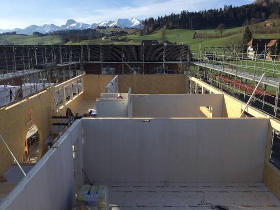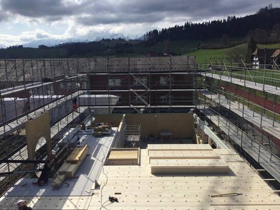 Als erste Etappe wird derzeit die Schulanlage Aebnit um einen Neubau ergänzt. Das Gebäude ist ein dreigeschossiger Elementbau in Holzbauweise, der im April 2025 aufgerichtet wurde. Das Erdgeschoss, das erste Obergeschoss sowie das zweite Obergeschoss sind bereits so erstellt, dass sie künftig Schulräumlichkeiten beherbergen können. Besonders vorausschauend geplant ist auch das dritte Obergeschoss, welches als Reserve im nicht gedämmten Rohbau bereits erstellt ist aber noch nicht bezogen wird. Die Einheit 3. OG wurde in die Holzkonstruktion integriert und kann bei Bedarf rasch als zusätzlichen Schulraum ausgebaut und in Betrieb genommen werden – hierfür müssen lediglich vorbereitete Fensterausschnitte geöffnet, Fenster eingesetzt und die Wände gedämmt werden. Der Lift und das Treppenhaus sind bereits bis in die oberste Etage fertiggestellt.