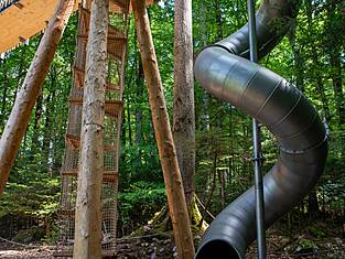 Der Waldspielplatz beim Wirtshaus «Alter Bären» wird um eine Attraktion reicher. Der 25 Meter lange Baumwipfelpfad lädt Familien zu spannenden Naturerlebnissen in luftiger Höhe ein – inklusive einer fast acht Meter langen Rutschbahn als krönenden Abschluss.