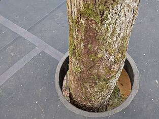 Die vorgefertigten Halbplatten wurden passgenau um den Baumbestand gelegt, mit EPDM-Kautschukfolie wettergeschützt verkleidet und mittels einem Alu-Profil fixiert. Entstanden ist ein bis ins Detail präzise ausgeführtes Holzbauprojekt, welches optisch überzeugt und den hohen Anforderungen an die Dauerhaftigkeit gerecht wird.