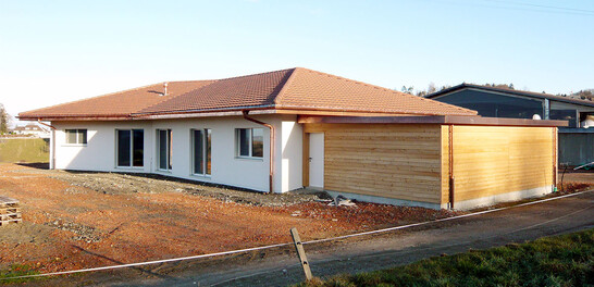 Das Einfamilienhaus befindet sich in ländlicher Lage im Freiburger-Mittelland. Das Holzhaus ist nicht unterkellert und steht auf einer Fundamentplatte. Das Haus besteht aus einem Geschoss und einem Estrich. Die Aussenfassade besteht aus einer Holzfaserplatte mit einem Aussenputz. Das gesamte Haus wurde vollständig vorgefertigt und nach nur 4 Monaten Bauzeit war das Gebäude bezugsbereit.
