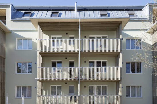 Die Stiftung PWG hat ein Portfolio von über 150 Liegenschaften im Raum Zürich mit einem Anlagewert von rund 700 Millionen Franken. Preisgünstige Mieten zu sichern, ist oberstes Ziel der Stiftung. Eine der Wohnliegenschaften mit preisgünstigem Wohnraum befindet sich an der ruhigen Saumackerstrasse. Im Jahr 2015 hat die Stiftung die Liegenschaft mit Baujahr 1948 aufgestockt und sechs zusätzliche Wohnungen geschaffen. Die Aufstockung wurde im Minergie Eco Standart geplant und ausgeführt. Gleichzeitig ersetzte die Bauherrschaft die bestehenden Balkone mit einer grösseren Massivholzkonstruktion.
