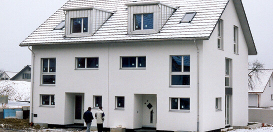 Das komplette Gebäude wurden in Brettstapel-Bauweise erstellt. Aussenwände, Innenwände, Gebäudetrennwände, aber auch Decken und Dächer inklusive Lukarnen wurden in dieser Bauweise gebaut. Das Augenmerk wurde auf die Gebäudetrennwand gelegt. Damit sie den hohen Schallschutz-Anforderungen entspricht, wurde sie als zweischalige Konstruktion ausgeführt.