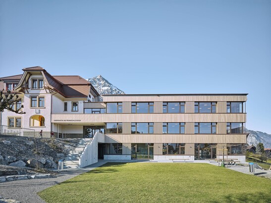 Das Primarschulhaus in Aeschi bei Spiez wurde durch einen dreigeschossigen Neubau in Holzbauweise erweitert. Im neuen Schulhausteil befinden sich Schulzimmer, Gruppen- und Werkräume und Platz für einen Kindergarten. Die drei überirdischen Geschosse wurden komplett in Holz erstellt. Das Sockel- und Untergeschoss wurden betoniert. Beim Bau des Gebäudes wurde bereits an die Zukunft gedacht: Die Innenwände sind nicht tragend und ermöglichen so maximale Nutzungsflexibilität. Zudem sind alle Bauteile so dimensioniert, dass das Schulhaus zu einem späteren Zeitpunkt um ein Geschoss aufgestockt werden kann. Dazu werden die Kräfte grösstenteils über die unten eingespannten und die gesamte Gebäudehöhe durchlaufenden Holzstützen abgeleitet.