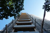 Für die Bauarbeiten bei den drei Hochhäusern der Überbauung Wolkenwerk in Zürich wird je an einer Fassadenseite ein Gerüstturm benötigt. Eine temporäre Holzkonstruktion abgestellt auf einer Betondecke bewies sich als beste Lösung. Pro Geschoss ermöglicht eine Plattform das Ein- und Ausladen der Baumaterialien. Die 70 Meter hohen Gerüsttürme sind so konzipiert, dass sie lediglich für die Aussteifung an den Gebäuden befestigt werden. Alle Lasten werden in der Holzkonstruktion abgeleitet, sodass die Hochhäuser nicht mit zusätzlichen Gewichten belastet werden.