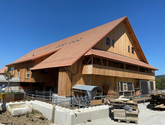 Das Bauprojekt besteht aus einem Ersatzneubau und einem anschliessenden Eventteil. Die Scheune ist bis auf das Betonfundament als Holzkonstruktion geplant. Die Terrainebene dient der Tierhaltung. Die beiden über den Stallungen angeordneten Zwischenböden dienen dazu, Stroh und Heu zu lagern. Das Heulager wird mit einer Unterlüftung ausgerüstet. Zusätzlich befindet sich ein Heukran in der Scheune. Ausserhalb der Scheune sind auf der einen Seite ein Büroraum und auf der anderen ein Boden für die Lagerung von Heuballen an die Binder aufgehängt. Dieser aufgehängte Heuboden auf der Aussenseite der Scheune an die Binder musste genau geplant werden. Die Scheune musste zudem den Anforderungen an einen Heukran gewachsen sein.