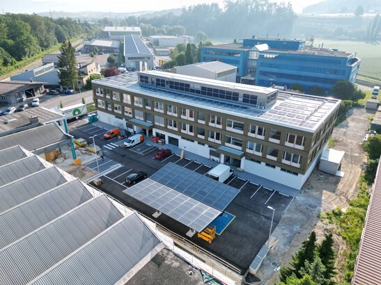Das gesamte Erdgeschoss ist als Verkaufsladen konzipiert. In den Obergeschossen befinden sich flexibel einteilbare Gewerbeflächen, welche verschiedene Nutzungen zulassen. Die grosszügige Photovoltaikanlage auf den Dachflächen erzeugt den Strom für die Liegenschaft sowie für die E-Tankstellen, welche den Autos und Velos dienen.