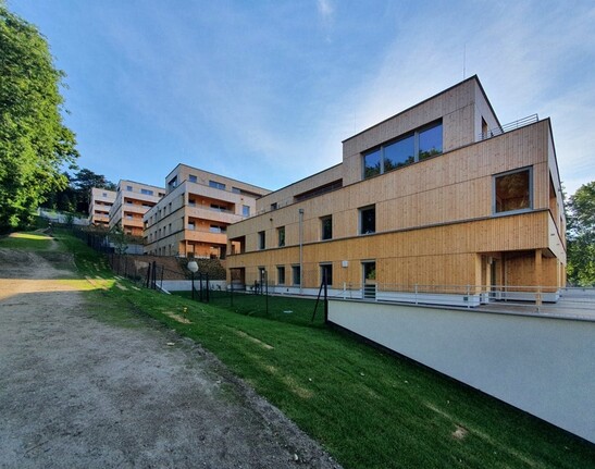 L'ensemble résidentiel se compose de quatre corps de bâtiment étagés sur la pente. corps de bâtiment. Les corps de bâtiment en surface sont construits en bois. Les Les façades légères à haute isolation thermique ont été recouvertes d'un bois de mélèze non traité. de bois de mélèze. Les éléments de façade ont été préfabriqués en usine avec préfabriqués en usine, ce qui permet une construction rapide et rentable ainsi qu'une garantit un niveau de qualité élevé. Tous les éléments peuvent être recyclés en fin de vie. bien être déconstruites et recyclées. À l'intérieur, les plafonds en bois sont visibles. Outre les avantages économiques et écologiques, cela crée une atmosphère agréable. atmosphère d'habitation.