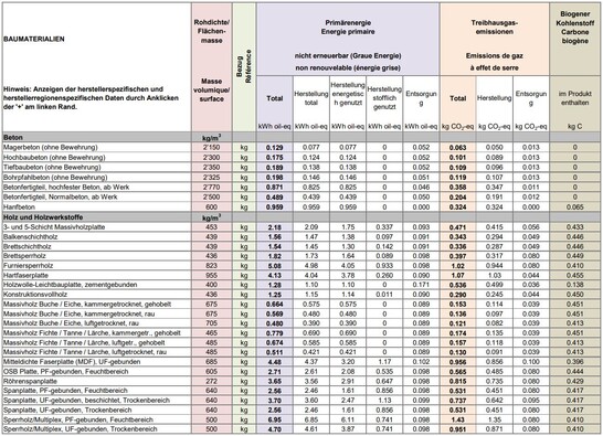 Liste KBOB des données d'écobilan : Les données d'écobilan se basent sur les flux de matières et d'énergie, qui sont évalués en fonction de leur importance pour l'environnement. L'écobilan d'un bâtiment peut être déterminé en grande partie à l'aide de ces données.