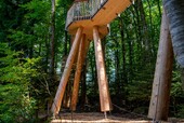 Le sentier des cimes est conçu comme une construction en bois filigrane à partir de troncs d'épicéas régionaux non traités. Les plateformes en CLT qui le recouvrent sont placées avec précision autour des arbres et protégées par un revêtement en caoutchouc. Des fentes de décharge et des renforts transversaux dans les troncs ronds garantissent que les fissures de séchage n'apparaissent qu'aux endroits souhaités.