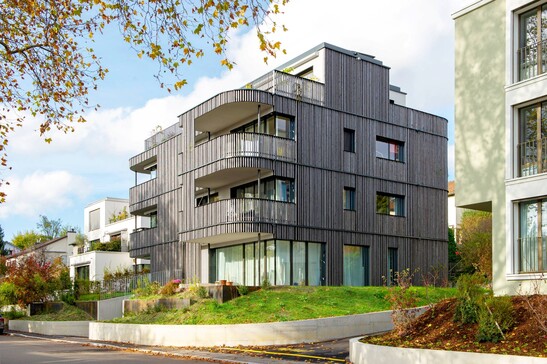 L'immeuble collectif possède un sous-sol avec un garage souterrain, des locaux techniques et des caves en béton armé. Au-dessus, il y a 4 étages en construction purement en bois avec une cage d'escalier en bois et un contreventement du bâtiment. La façade est constituée d'un bardage bois vertical et pourvue de tabliers pour la protection incendie.
