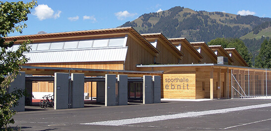 La membrure inférieure est constituée d'un tube d'acier (ROR 193,7 x 8), les entretoises (ROR 114,3 x 16) également. Pour la membrure supérieure (2 x 19 / 56 cm) et les poteaux (22 x 40 cm), on a choisi du bois lamellé-collé. Les "chevrons" (220 / 400) sont également en bois lamellé-collé. La surface du toit inclinée à 20° transmet environ 20% des forces de cisaillement et est donc pourvue d'une vitre clouée sur toute sa surface en OSB 22 mm. Ainsi, le contreventement horizontal des fermes en treillis est également résolu. Une grande attention a été accordée à la construction adaptée au chantier de la transmission des forces. Le côté ouest du hall a été réalisé en ossature bois, les poutres de toit étant respectivement posées sur des piliers en béton armé. Les murs des côtés nord et sud sont réalisés en ossature bois, le mur est en béton armé. La couverture est constituée de plaques d'Eternit de grand format ventilées par l'arrière. L'aile d'entrée (foyer, vestiaires et salle polyvalente) est également réalisée en bois. La structure porteuse du toit se compose de poteaux et de poutres transversales ainsi que de la couche de planches optiholz acoustiquement efficace qui les recouvre. Le toit au-dessus de l'aile d'entrée est végétalisé de manière extensive sur une isolation compacte.