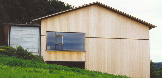 La consigne étant qu'aucune poutre ne devait être visible, celle-ci a été intégrée à la construction. L'élément porteur est constitué de poutres-caissons en panneaux trois plis et de nervures en bois lamellé-collé. L'extension de la salle de groupe a été réalisée sous forme d'éléments en bois.