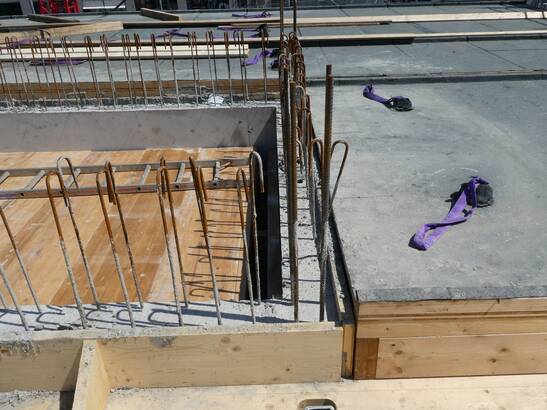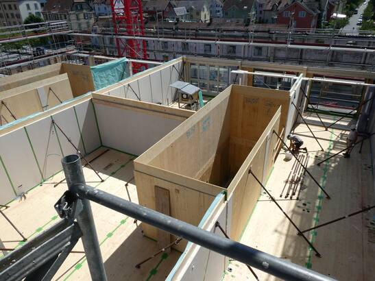 Les avantages de cette nouvelle approche sont évidents : il faut beaucoup moins de profilés en acier et de vis, la liaison entre la structure en bois et le noyau de béton est plus simple et le temps de construction est plus court. Le montage et le démontage de l'échafaudage et du coffrage pour le noyau de béton ne sont plus nécessaires et la quantité de béton utilisée peut être réduite. Et ce, à performance égale : le béton coulé ultérieurement est lié à la structure en bois par une liaison de forme et de force. Les noyaux des cages d'escalier servent au renforcement statique des bâtiments et garantissent les voies d'évacuation en cas d'incendie.