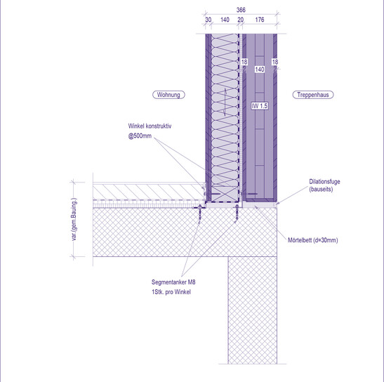 Detail of the transition between the solid floors and the wooden structure. The timber elements are placed on a on a 30-millimeter-thick mortar bed and installed with segmental anchors. The encapsulated stairwell made of cross-laminated timber panels is clearly visible.