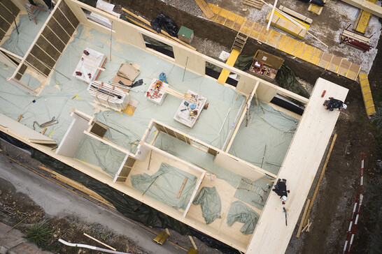 The basement is made entirely of cross-laminated timber. All components will be joined in TS3 construction to form large-area panels, thus forming a monocoque. In the interior, non-load-bearing timber stud walls, basement compartment walls made of three-layer panels and load-bearing columns made of beech wood will be constructed.