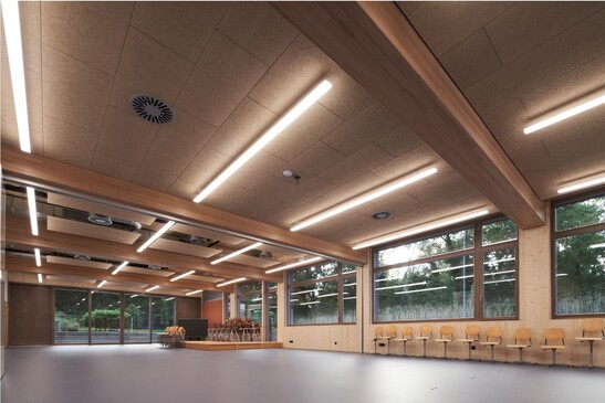 The almost ten-meter-wide multi-purpose room is spanned with glulam beams