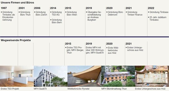 In spring 1997, Stefan Zöllig founded Timbatec in Steffisburg as a sole proprietorship. 25 years after the foundation, we have grown to a leading timber engineering company with 60 employees at five locations in Thun, Bern, Zurich, Delémont and Vienna. Especially in the last three years, growth has been strong - the workforce has almost doubled.