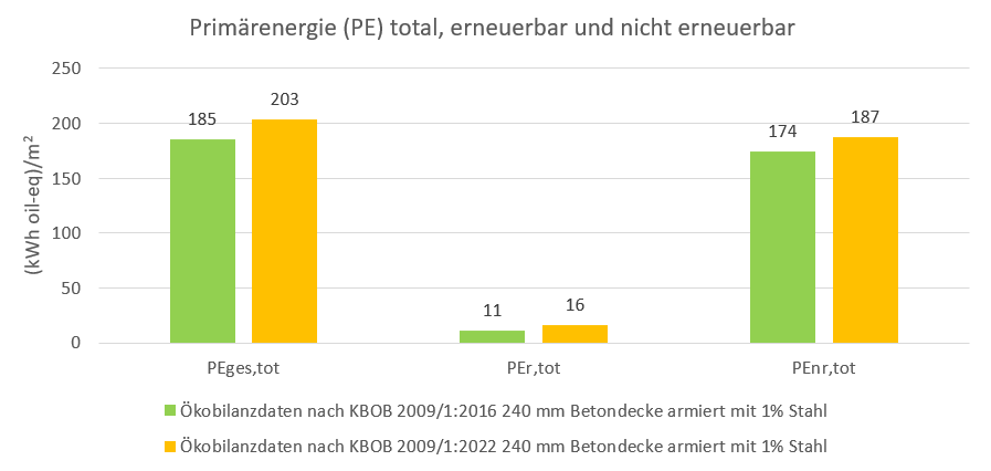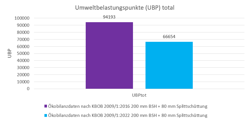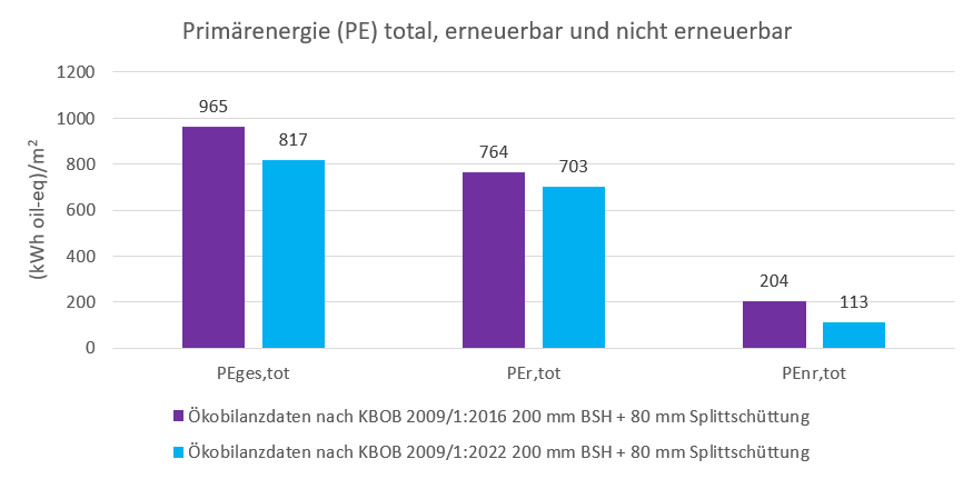 A 200-millimeter-thick cross-laminated timber ceiling with 80-millimeter-thick split fill for sound insulation was calculated with 94,193 environmental impact points (EIP) according to the old KBOB data. The new figure is only 66,654 UBP. A significant improvement in the data is also evident in the area of primary energy for the production of building materials. The biggest difference, however, is in greenhouse gas emissions. According to the old data basis, a square meter of cross laminated timber ceiling including fill emits 40 kg CO₂ equivalent (CO₂-eq). The new figure is 24 kg CO₂-eq. This is a reduction of 40%. At the same time, the stored biogenic carbon may be counted today: In one square meter of the example ceiling, there are 153 kg CO₂-eq.
