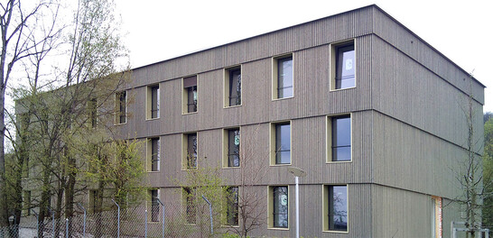The new building, a three-story wooden structure, stands on piled strip footings and is air-laid. Floor box girder elements were laid over the foundations, and these were also used for the false ceiling and flat roof. The room partition walls are simple stud constructions with planking on both sides, which have to fulfill specified fire resistances according to the use and requirements.