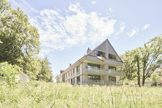 From the ceiling slab above the underground garage, four floors were built in timber construction. The encapsulated cross-laminated timber panels separate the stairwell from the residential section. The load-bearing wall made of cross-laminated timber runs through the middle of the building directly under the ridge and both transfers the vertical loads and serves as bracing.