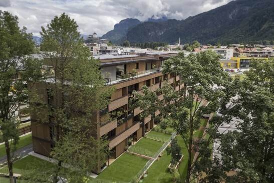 Since the NaturQuartier Weißache is the largest wooden residential building in Tyrol with 5 floors (building class 5), the coordination with the local authorities regarding fire protection was very challenging. The dimensioning of the elevator shaft was also exciting, since it is not the forces in the built state that are decisive here, but the forces that act during assembly.