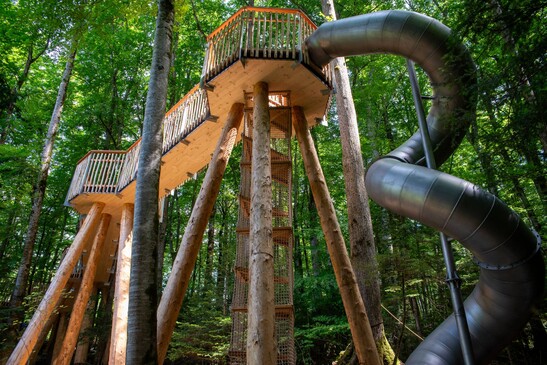 A new treetop walkway has been created at the inn «Alter Bären» in the Ballenberg Open-Air Museum as a summer attraction for families. The walkway is around 25 meters long, winds its way through the forest at a lofty height, and ends with an almost eight-meter-long slide. The attraction is complemented by a tinkerer's corner for marble runs and playful learning stations on the theme of the forest. The facility combines nature, knowledge, and exercise. Realized as a regional timber construction project using natural spruce trunks and CLT platforms, the trail stands for sustainable architecture and communal experiences.
