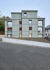 The replacement building on Breitestrasse in Wallisellen is a four-story apartment building with ten units, constructed entirely from timber elements. The timber structure stands on a concrete foundation with an underground car park. The rear-ventilated facade made of glazed fir wood combines vertical and horizontal battens and integrates a horizontal fire barrier. The stairwell is designed as an economical timber structure with encapsulated frame elements and stairs and platforms made of precast concrete.