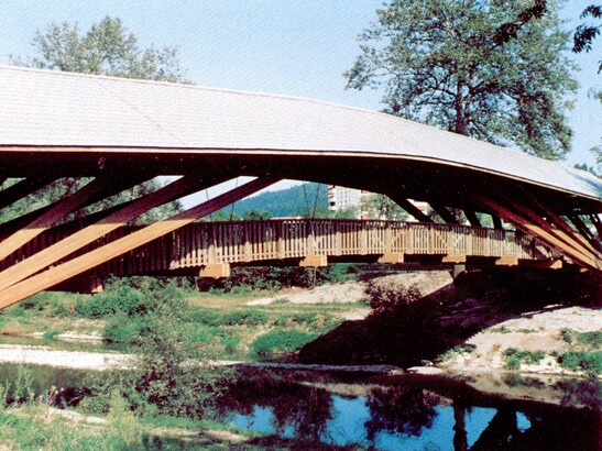 The Töss Bridge is a truss bridge with a length of 48.00 m and a width of 3.00 to 3.80 m. The deck is made of transversely prestressed planks 6 x 3 cm. The waisted deck consists of transversely prestressed planks 6 x 10 cm. It rests on double-guided transverse beams suspended from steel round bars. The struts are double-guided. They run from the support joint below the deck to the axles every 4.70 m at the truss. In addition to the stiffening deck slab, the primary wind bracing of parabolically laid, prestressed spiral wire ropes (Ø 25 mm) and the secondary wind bracing in sawn timber as St. Andrew's crosses are also used for wind bracing. All components are made of pressure-impregnated white fir.