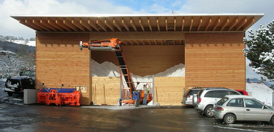 The decision Since wood behaves absolutely problem-free in contact with salt in contrast to other building materials, the client decided in favor of a wooden building. The new single-story salt storage hall serves as a storage and handling building for de-icing salt. The execution The floor slab and the 1.3 m high base are made of cast-in-place concrete. The remaining walls and the roof are made of wood. The salt is filled into the hall with a blowing device attached to the roof. When the hall is filled with salt, horizontal bearing loads are applied to the wooden structure.