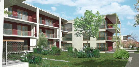 The Brüggliäcker housing estate is a replacement building realized by the Bahoge building cooperative between the streetcar line and Funkwiesenstrasse in Zurich Schwammendingen.