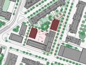 The east-west project complements the existing buildings with two parallel, almost identical structures, differing only in their storeys. This spatially ties the courtyard space of the fire department with the green outdoor space of the neighboring residential development. Between the two properties, along the fence, the design team proposes a filter of newly planted columnar oaks, under which a large part of the uncovered bicycle parking will be placed. The courtyard is accessible in a natural way from the east and west via alleys between the existing and new buildings and along the property line in the north.