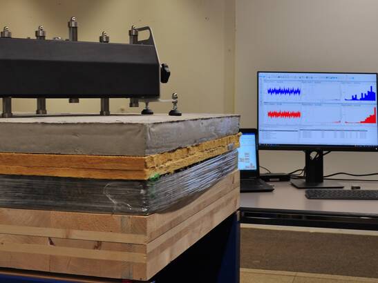 We use the impact sound test bench to measure the change in impact sound insulation by adjusting individual layers. In this example, a tried and tested floor structure serves as a reference variant. One layer is changed in each of two variants and the influence on the sound insulation values and the ecological balance is analyzed.