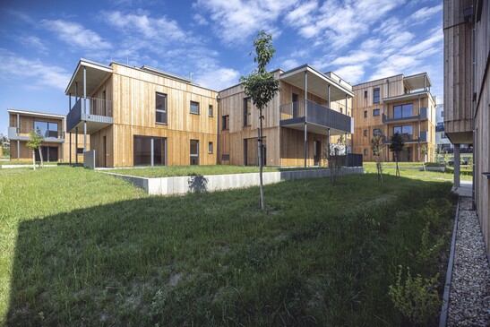Die Wohnhäuser im Süden des Quartiers setzen voll und ganz auf umweltbewusstes Leben. Der Einsatz von Holz ist daher die logische Konsequenz. Bei den mehrgeschossigen Wohnbauten ist die Tragstruktur aus dem natürlichen Rohstoff Holz. Sichtbares Holz an den Decken sowie an einzelnen Wänden schaffen ein natürliches, beruhigtes und angenehmes Wohngefühl. Timbatec begleitete das Projekt als örtliche Bauaufsicht und steht dem Projektteam in statischen, bauphysikalischen und brandschutztechnischen Fragen zur Seite.