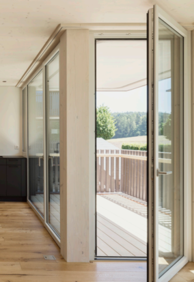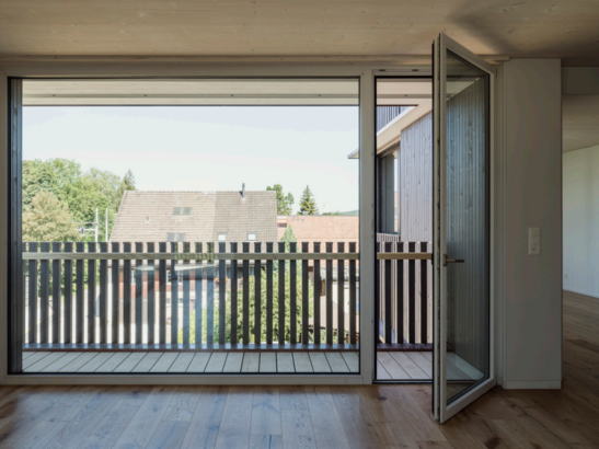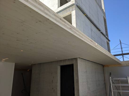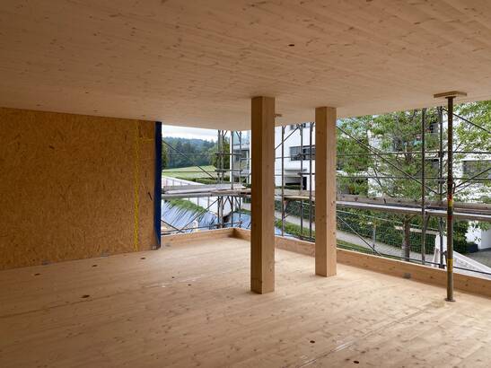 Wärmebrücken einfach gemacht. Wegen der tiefen Wärmeleitfähigkeit von Holz, braucht es keine aufwändigen Kragplattenanschlüsse. Die CLT-Decke läuft von der Wohnung zur Loggia einfach durch. Diese Konstruktionsweise ermöglicht die Stützen-Platten-Konstruktion von TS3 und den nicht tragenden Aussenwänden.
