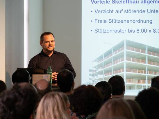 TS3 ermöglicht Grossflächen aus Holz. Mit einem speziell entwickelten Giessharz werden Brettsperrholzplatten auf der Baustelle miteinander verbunden. Die resultierenden Decken überspannen ein Raster von 8 mal 8 Metern und erlauben damit offene Grundrisse. «Unterzüge entfallen, Stützen setzen Sie mit dem Salzstreuer», erklärt Sven Bill den über anwesenden 200 Personen.