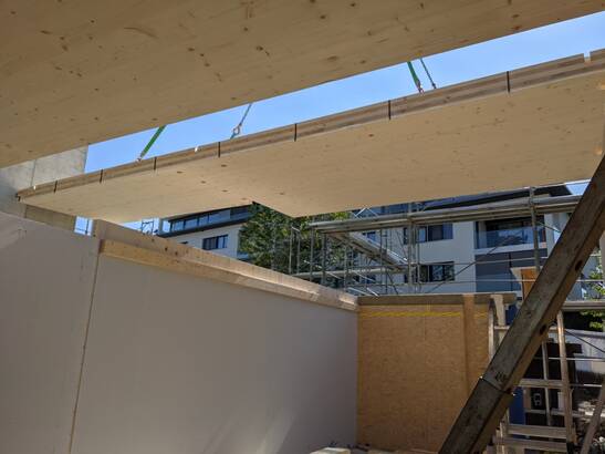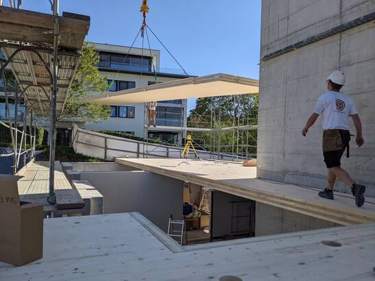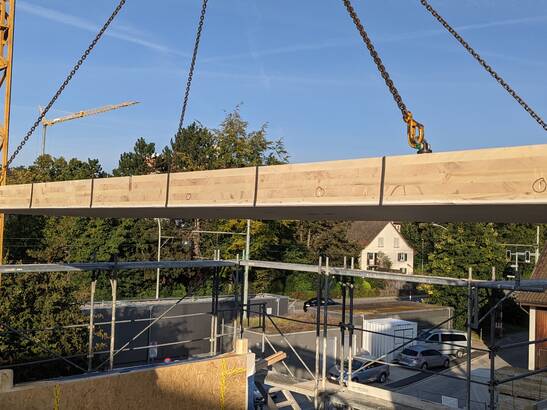Der überirdische Bau ist eine Holzkonstruktion, bestehend aus Holzstützen und mit der TS3-Technologie verbundenen Brettsperrholzplatten. Die Timber Structures 3.0-Technologie, kurz TS3, ist ein Verfahren, das Grossflächen aus Holz ermöglicht – ohne die bisher üblichen Unterzüge. Diese Grossflächen können den Stahlbeton in den meisten Bereichen ersetzen und eignen sich auch für Geschossdecken wie in Zollikerberg. TS3 verbindet Holzbauteile über deren Stirnseite biegesteif miteinander. Das galt über Jahrzehnte als unmöglich. Zehn Jahre Forschung zusammen mit der ETH Zürich und der Berner Fachhochschule waren nötig, um die Lösung zu finden: Ein Verfahren mit einem Zwei-Komponenten Polyurethan-Giessharz. Dieses Harz verbindet die Holzelemente und ermöglicht eine neue Holzbauweise.