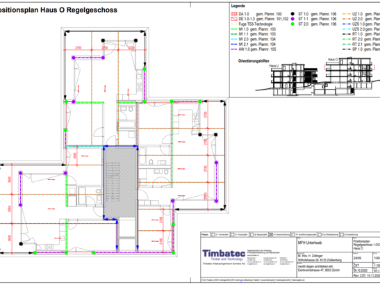 Die Geschossdecken liegen lediglich auf den Stützen, die meist in den Aussenwänden positioniert sind, und dem Treppenhauskern auf. Die Räume können so sehr flexibel gestaltet werden. Im Positionsplan sind die Stützen (Punkte), die wenigen tragenden Wände und die TS3-Fugen zu erkennen. Insgesamt wurde 520 Meter TS3 Fugen erstellt.