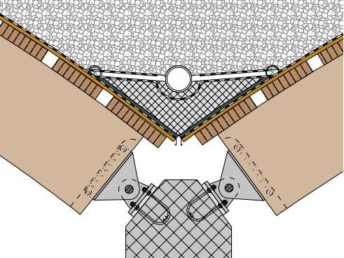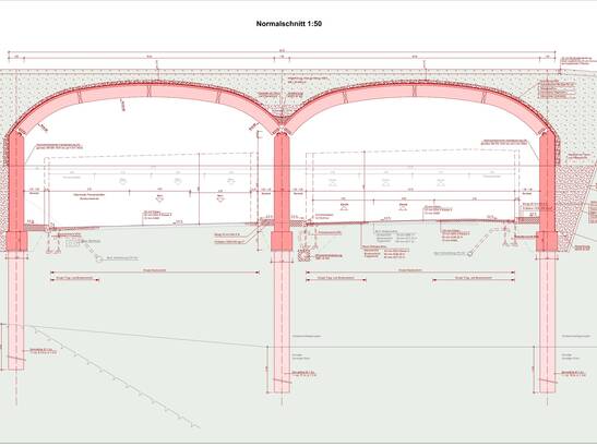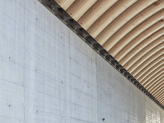 Die 156 Bogenträger aus Brettschichtholz mit einem Querschnitt von 240 x 760 Millimeter und die Betonwände spielen zusammen: seitliche Kräfte auf die Betonwände werden durch die Holz-Bogenkonstruktion aufgenommen. Die Bogenbinder wiederum stützen sich horizontal wie vertikal auf die Betonwände ab. Stahlgelenke verbinden die Holzbinder mit den 80 Zentimeter dicken Ortbetonwänden. Die stützenden Eigenschaften des Erdreiches wurden mit Federauflagern und mit berechneten Federkonstanten modelliert.