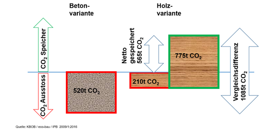 Die 850 Kubikmeter Bauholz für die Überdeckung der Wildtierbrücke wuchsen im Schweizer Wald in dreieinhalb Stunden nach. In dieser Zeit entzog es der Umwelt mit der Fotosynthese 775 Tonnen CO₂. Die Ausführung der Überdeckung in Beton hätte einen CO₂-Ausstoss von 520 Tonnen CO₂ verursacht. Nach Abzug der Emissionen für die Produktion des Brettschichtholzes und der Stahlgelenke bleibt ein Delta zwischen der Holz- und der Beton-Variante von 1‘085 Tonnen CO₂.