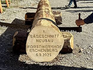 Baustart für den neuen Forstwerkhof Eschenberg: Nach intensiver Planung und Projektierung mit der Holzbaustatik von Timbatec soll der Werkhof Ende 2026 dem Forstbetrieb übergeben werden – eingeleitet durch den symbolischen Sägeschnitt der Stadträte.