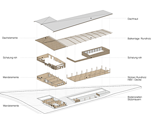 Der neue Forstwerkhof umfasst ein zweigeschossiges Betriebsgebäude in Holzbauweise und eine Einstellhalle für Maschinen, Geräte und Fahrzeuge. Über 95 % des Materials stammen aus stadteigenen Wäldern. Dabei wurde auf minimale Bearbeitung geachtet: Die Tragkonstruktion der Halle besteht aus Rundholz, das direkt aus dem Wald eingebaut wurde. Das übrige Fichten- und Tannenholz wurde in einer nahegelegenen Sägerei sowie bei regionalen Verarbeitern zu Brettern, Balken und Leimholz verarbeitet und kehrt schrittweise auf die Baustelle zurück. Kurze Transportwege machen den Neubau besonders energieeffizient und CO₂-speichernd; die Beheizung erfolgt mit stadteigenem Stückholz.