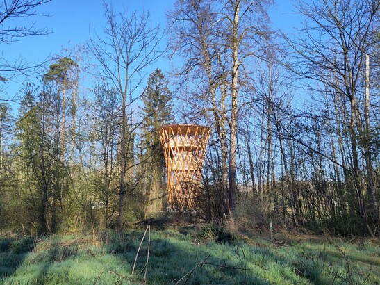 Der im Jahr 2025 fertiggestellte Beobachtungsturm befindet sich, von der Brücke Ellikerstrasse aus gesehen auf der linken Uferseite in Fliessrichtung der Thur, direkt an ihrem Ufer. Mit seinen 15 Metern ist er zwar ein imposantes Bauwerk, er fügt sich jedoch nahtlos in die Auenlandschaft ein. Auf acht und zwölf Metern Höhe befindet sich je eine Plattform, auf der Besucherinnen und Besucher die Natur beobachten und die Rundumsicht geniessen können. Das Projekt entstand aus einer Masterarbeit an der ETH Zürich.